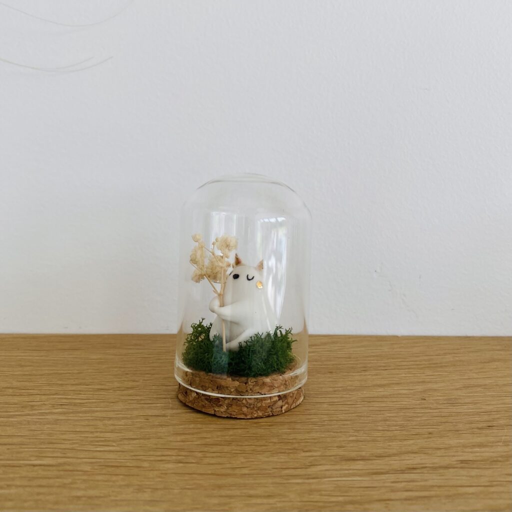 Petite série de personnages en porcelaine modelés à la main présentés dans une petite cloche en verre façon ‘Cabinet de Curiosités’ Taille Mini – Chaque pièce est unique Chat en porcelaine Sur son lit de mousse d’Islande (couleur stabilisée) & fleur séchée Habitat : mini cloche en verre (4/6 cm) – socle en liège Détails […]