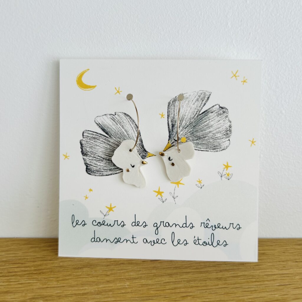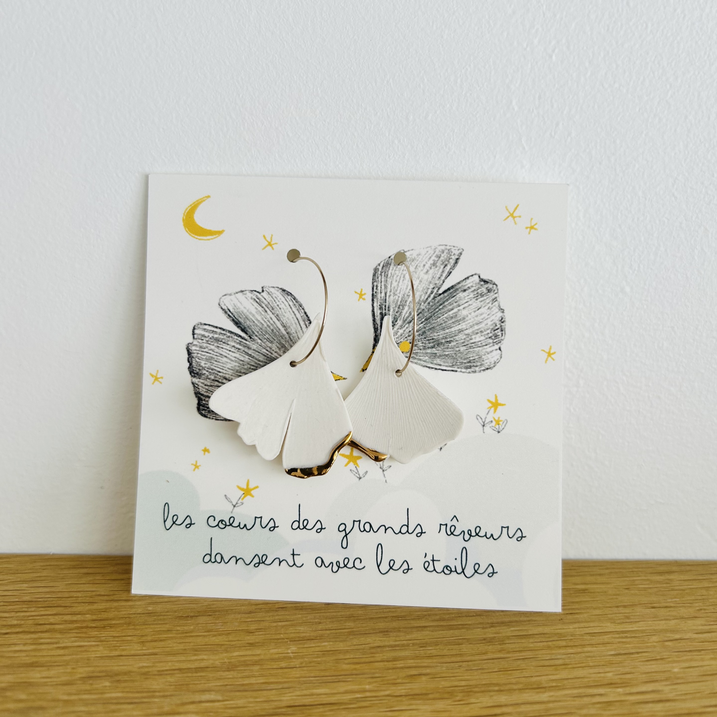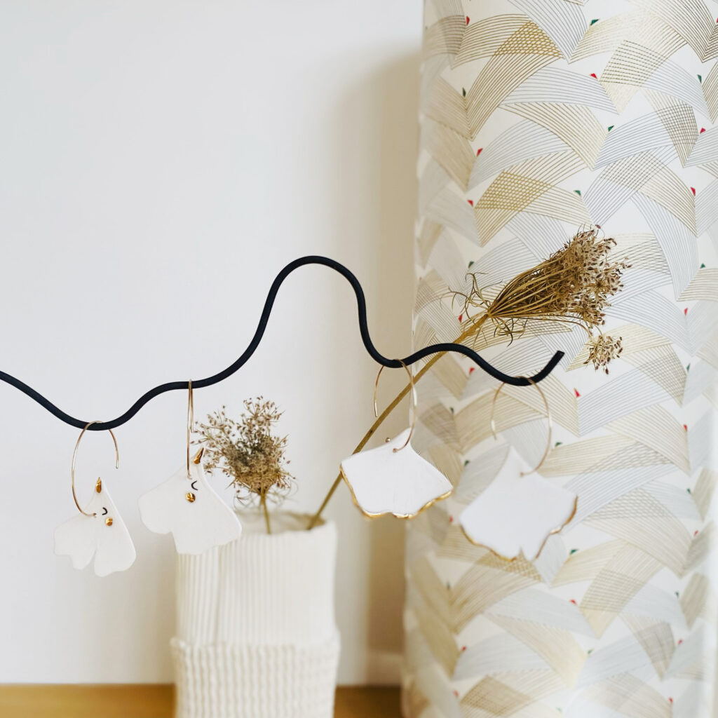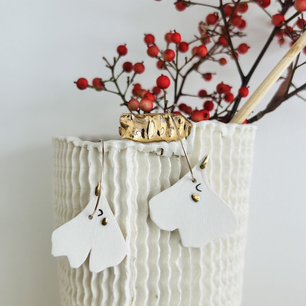 Porcelaine découpée et façonnée patiemment à la main, cuite plusieurs fois à haute température avant d’être fixée sur une monture en gold filled (laiton plaqué or, plus durable qu’un plaquage or classique) qui vous évitera tout risque d’allergie. Tantôt émaillée ou laissée brute, parfois partiellement émaillée afin de recevoir l’éclat d’or qui donnera au bijou […]