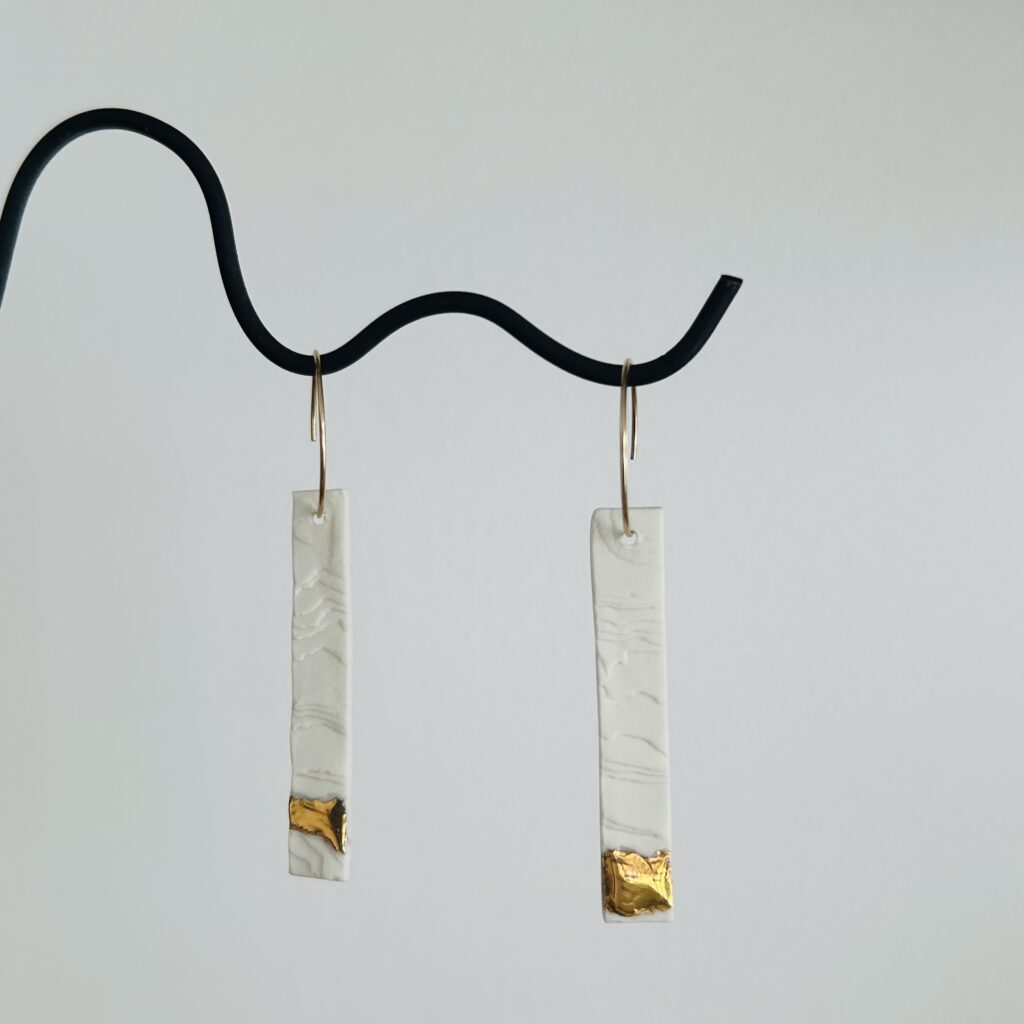 Porcelaine découpée et façonnée patiemment à la main, cuite plusieurs fois à haute température avant d’être fixée sur une monture en gold filled (laiton plaqué or, plus durable qu’un plaquage or classique) qui vous évitera tout risque d’allergie. Tantôt émaillée ou laissée brute, parfois partiellement émaillée afin de recevoir l’éclat d’or qui donnera au bijou […]