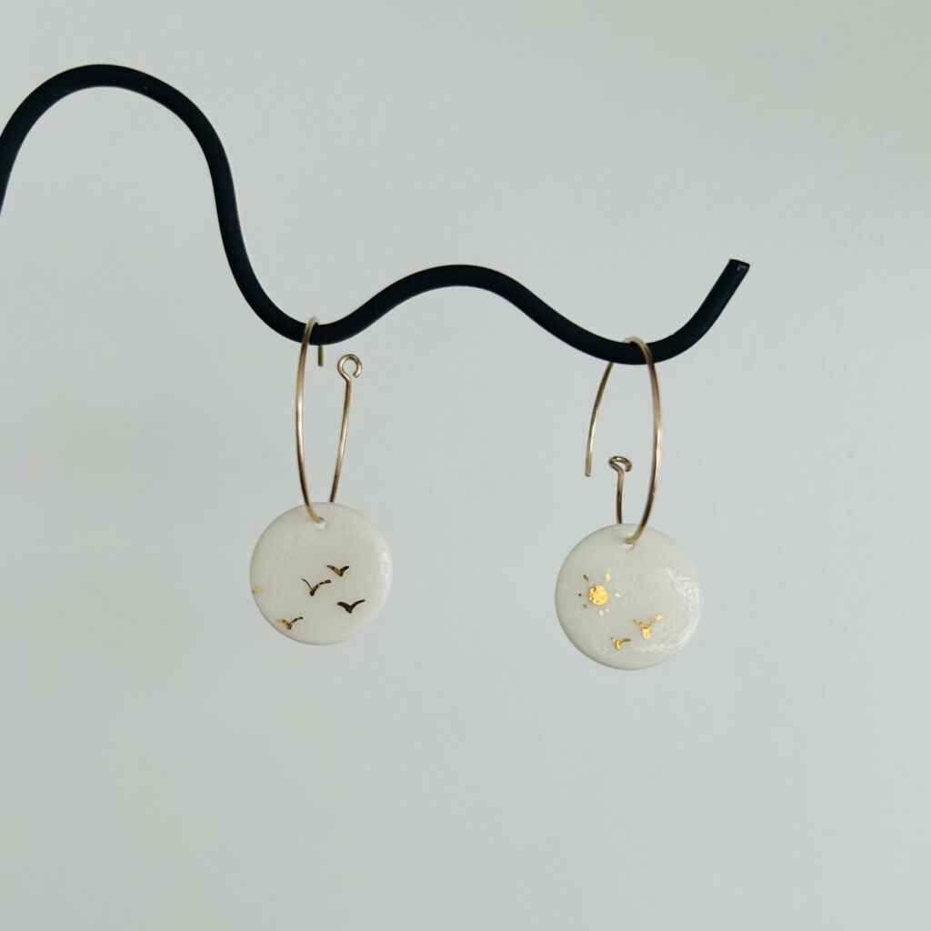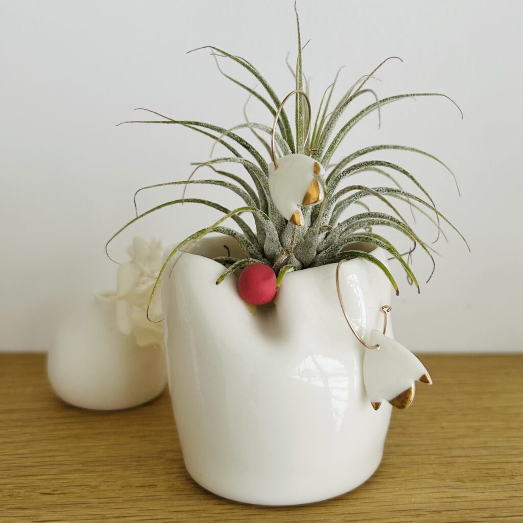 Porcelaine découpée et façonnée patiemment à la main, cuite plusieurs fois à haute température avant d’être fixée sur une monture en gold filled (laiton plaqué or, plus durable qu’un plaquage or classique) qui vous évitera tout risque d’allergie. Tantôt émaillée ou laissée brute, parfois partiellement émaillée afin de recevoir l’éclat d’or qui donnera au bijou […]