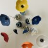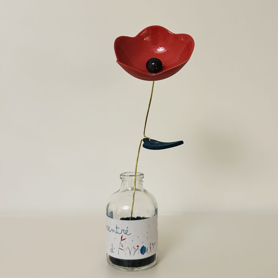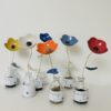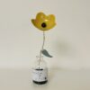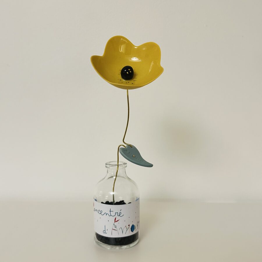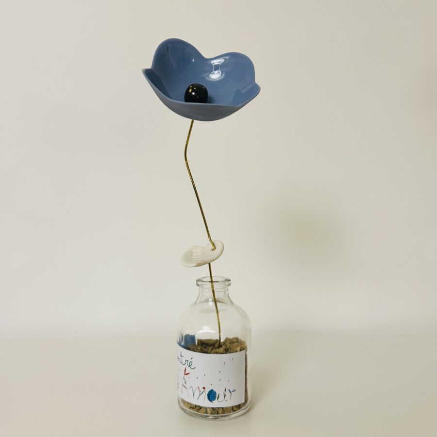 Fleur en porcelaine colorée accompagnée d’une feuille-message, destinée à rejoindre une simple plante verte ou à rester simplement dans son petit flacon en verre.