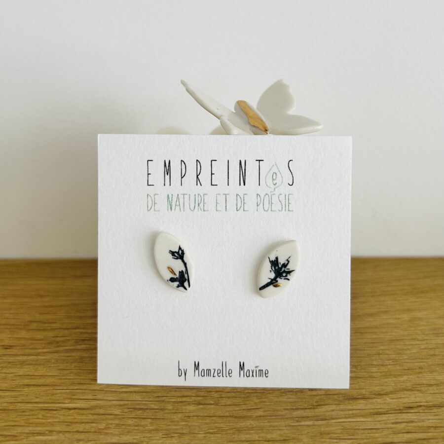Impression végétale sur porcelaine, travaillée aux oxydes ou pigments. La porcelaine est ensuite découpée et façonnée patiemment à la main, cuite plusieurs fois à haute température, avec pour terminer, un petit détail en or 15cts