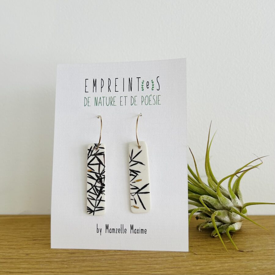 Impression végétale sur porcelaine, travaillée aux oxydes ou pigments. La porcelaine est ensuite découpée et façonnée patiemment à la main, cuite plusieurs fois à haute température, avec pour terminer, un petit détail en or 15cts