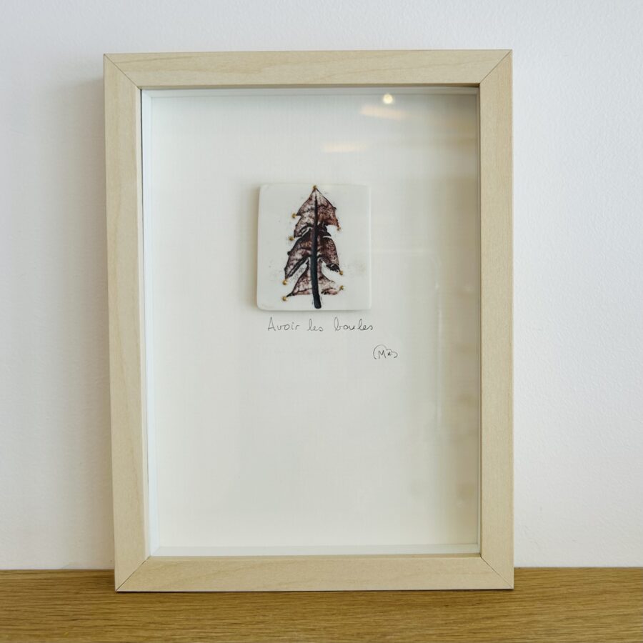 Impression végétale sur porcelaine, parfois travaillée aux oxydes ou pigments. La porcelaine est ensuite découpée, cuite plusieurs fois à haute température avant d’être collée en surépaisseur sur un support cartonné et encadrée, après avoir reçu le titre inspiré par la composition.