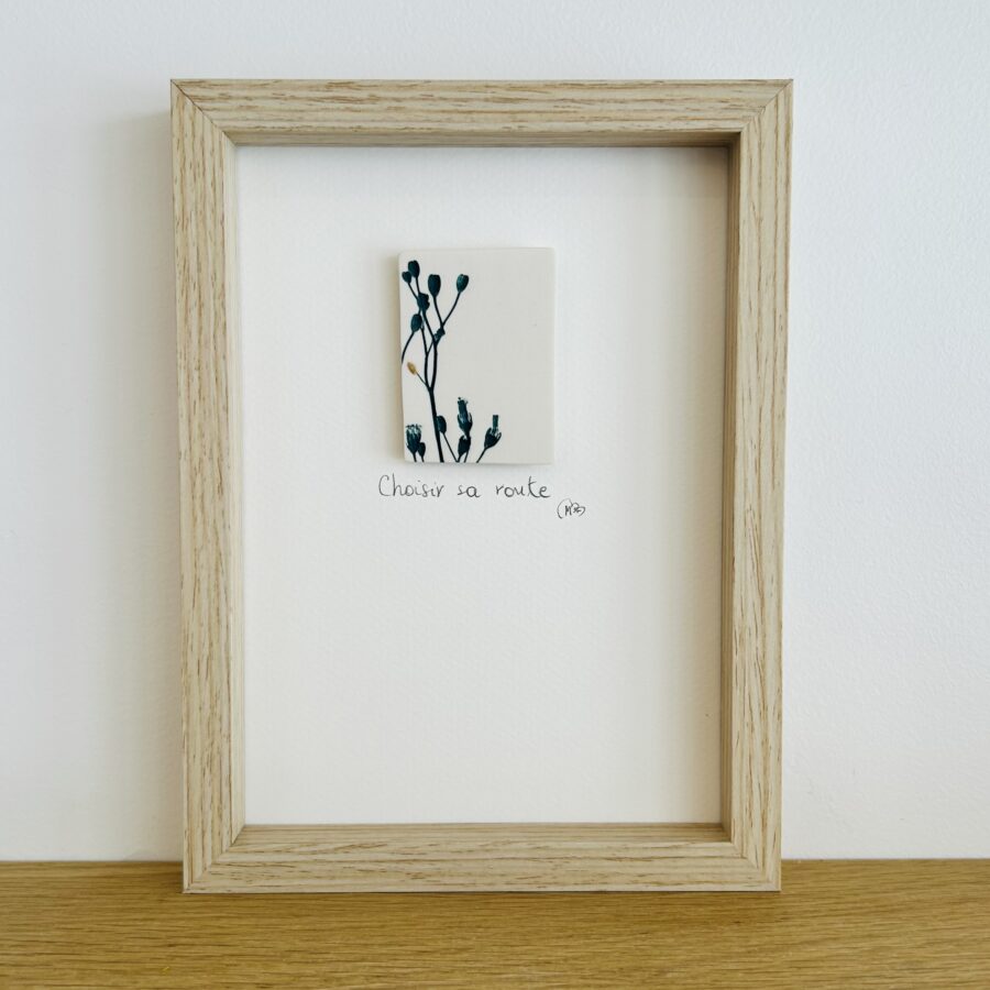 Impression végétale sur porcelaine, parfois travaillée aux oxydes ou pigments. La porcelaine est ensuite découpée, cuite plusieurs fois à haute température avant d’être collée en surépaisseur sur un support cartonné et encadrée, après avoir reçu le titre inspiré par la composition.