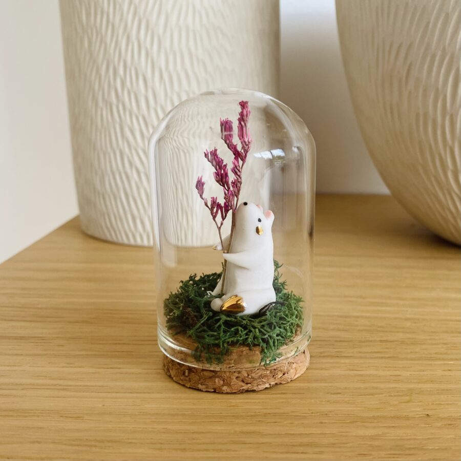 Petite série de personnages en porcelaine modelés à la main présentés dans une petite cloche en verre façon ‘Cabinet de Curiosités’