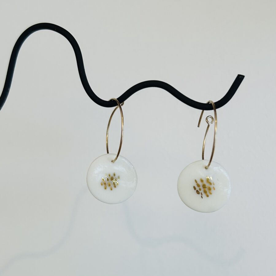 Porcelaine découpée et façonnée patiemment à la main, cuite plusieurs fois à haute température avant d’être fixée sur une monture en gold filled (laiton plaqué or, plus durable qu’un plaquage or classique) qui vous évitera tout risque d’allergie.