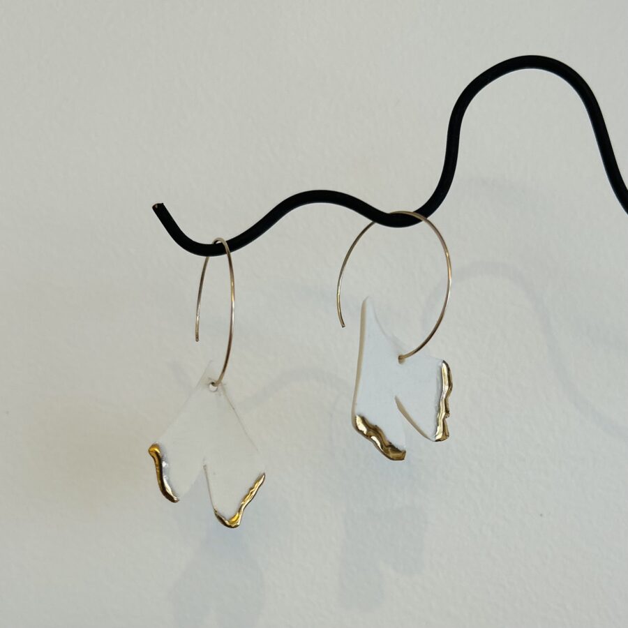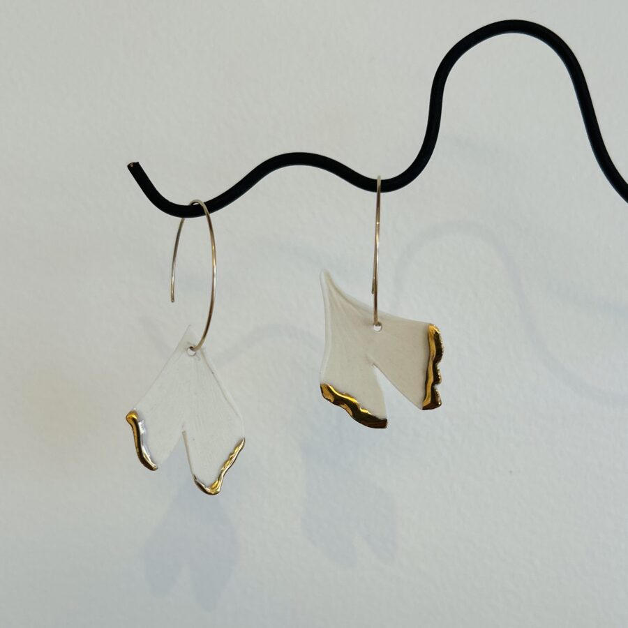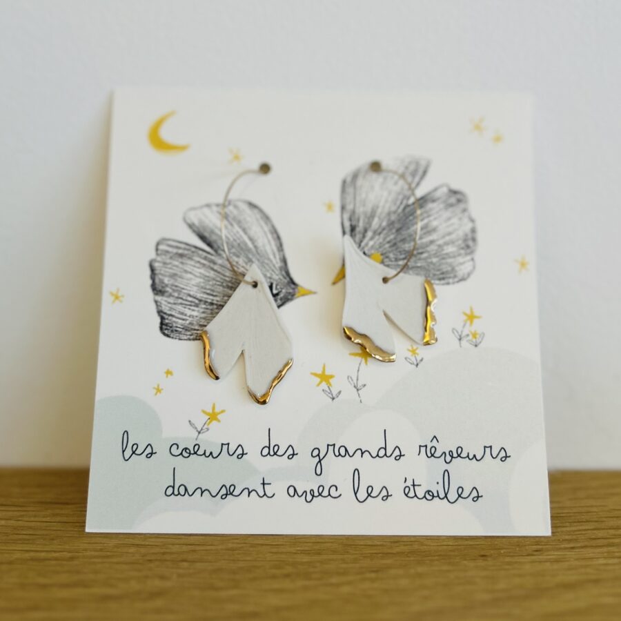 La texture de ses feuilles se prête totalement aux empreintes sur porcelaine, elle m’évoque depuis toujours un oiseau en plein vol, ce qui a donné naissance à une petite série de broches et boucles d’oreilles.