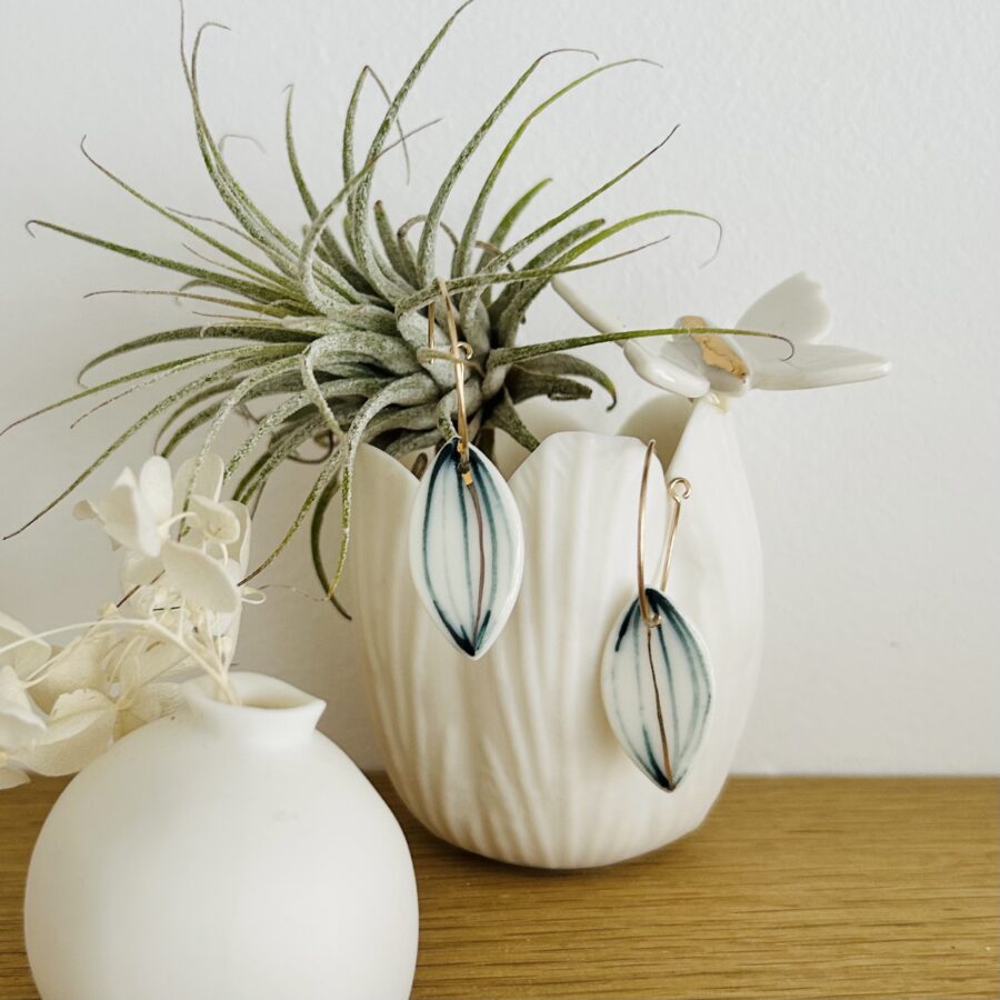Porcelaine découpée et façonnée patiemment à la main, cuite plusieurs fois à haute température avant d’être fixée sur une monture en gold filled (laiton plaqué or, plus durable qu’un plaquage or classique) qui vous évitera tout risque d’allergie.