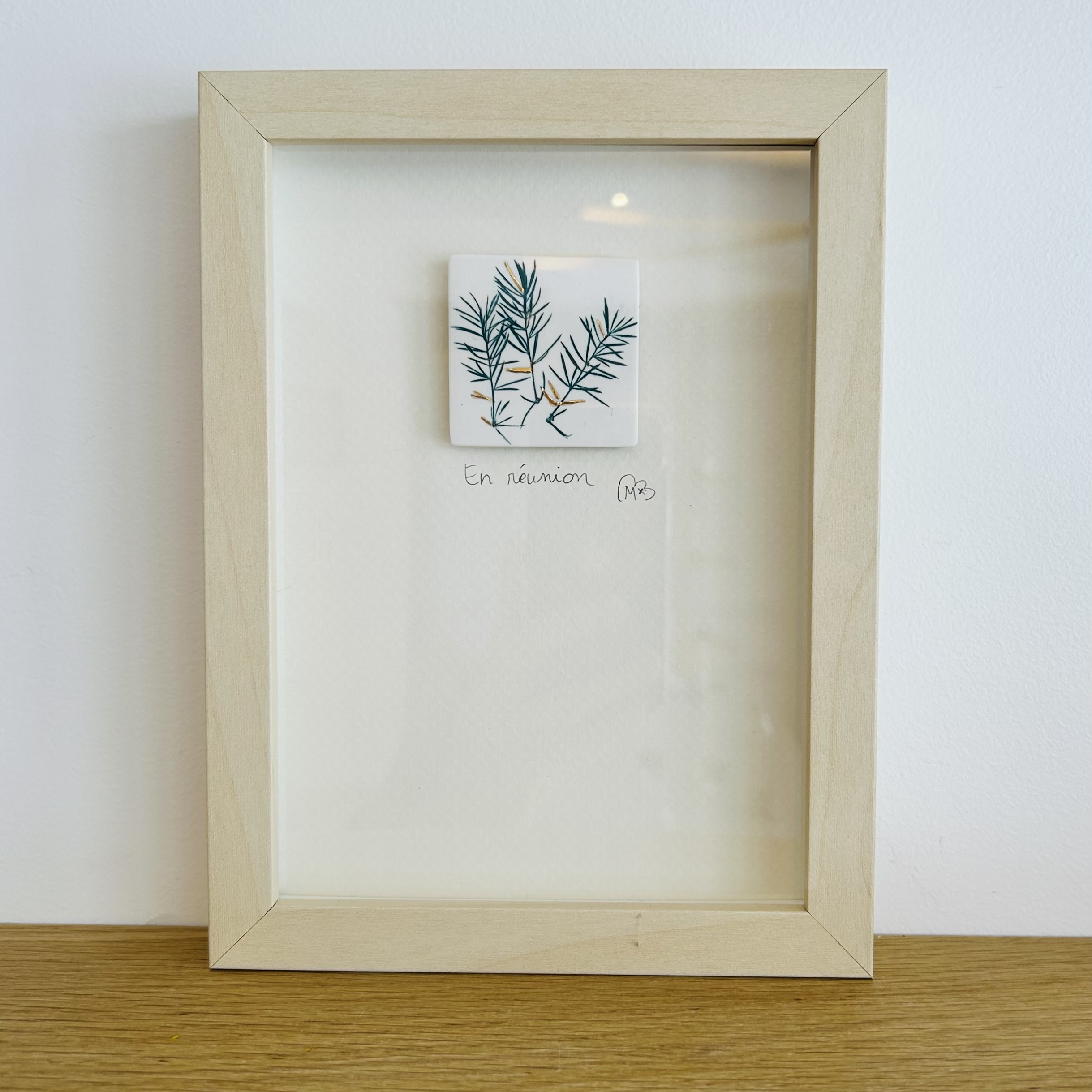 Impression végétale sur porcelaine, parfois travaillée aux oxydes ou pigments. La porcelaine est ensuite découpée, cuite plusieurs fois à haute température avant d’être collée en surépaisseur sur un support cartonné et encadrée, après avoir reçu le titre inspiré par la composition.
