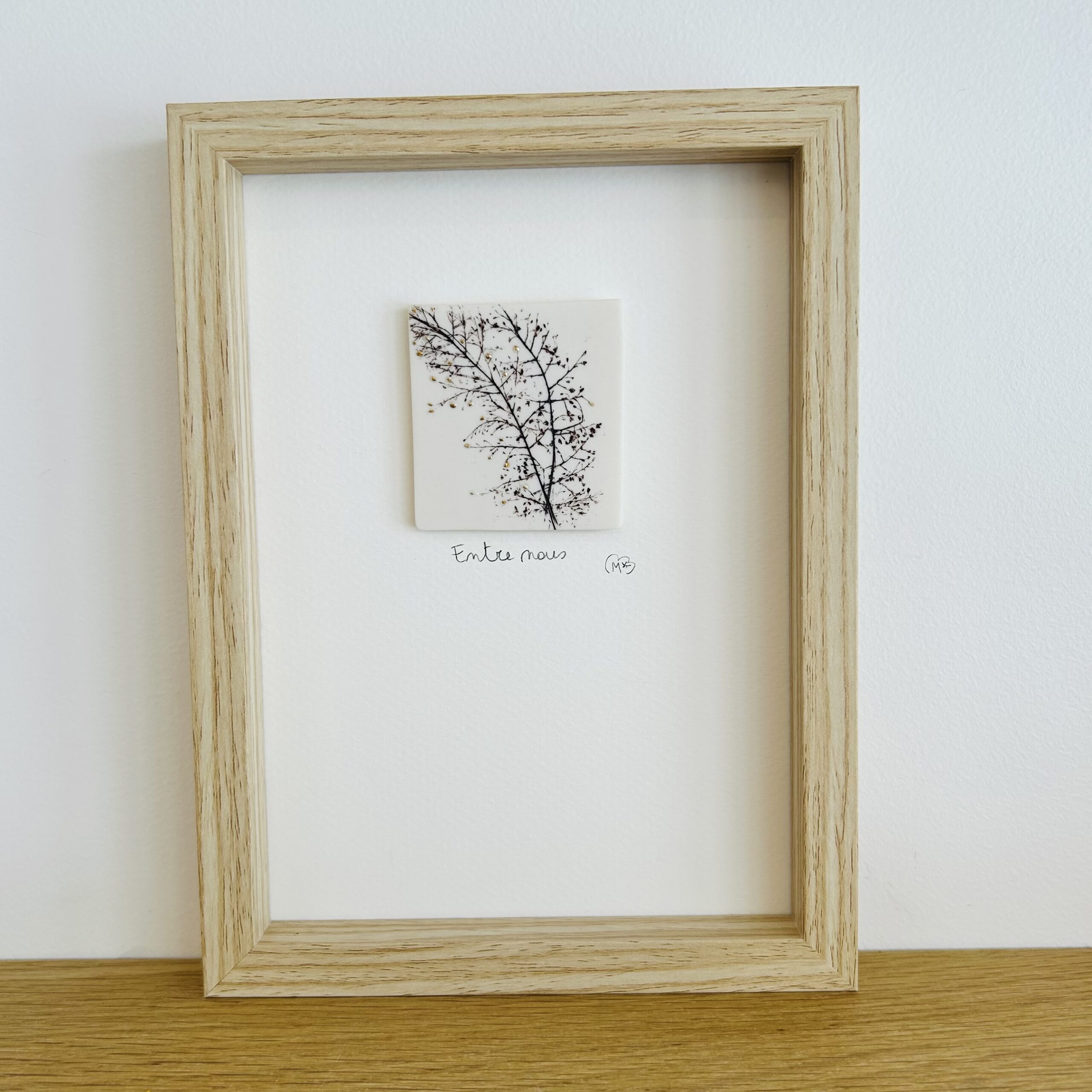 Impression végétale sur porcelaine, parfois travaillée aux oxydes ou pigments. La porcelaine est ensuite découpée, cuite plusieurs fois à haute température avant d’être collée en surépaisseur sur un support cartonné et encadrée, après avoir reçu le titre inspiré par la composition.