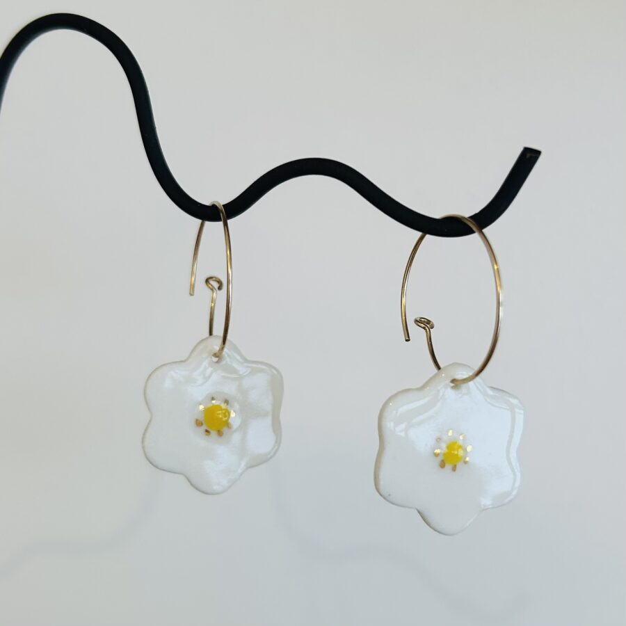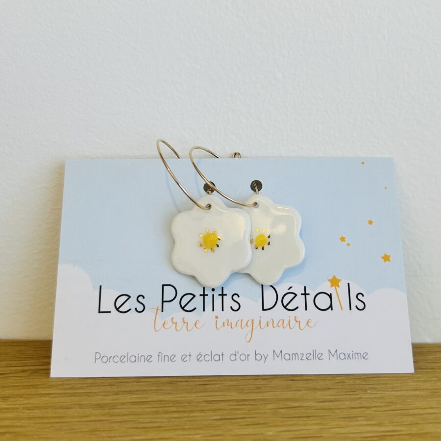 Porcelaine découpée et façonnée patiemment à la main, cuite plusieurs fois à haute température avant d’être fixée sur une monture en gold filled (laiton plaqué or, plus durable qu’un plaquage or classique) qui vous évitera tout risque d’allergie.