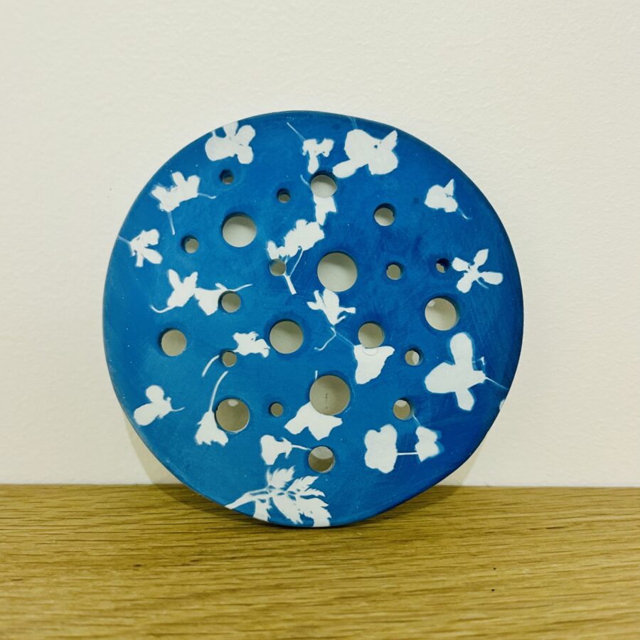 Lorsque textures et végétaux s’expriment et s’impriment dans la porcelaine, c’est l’univers tout entier qui s’habille de bleu’. Chaque pièce est unique et est composée d’éléments principalement naturels, transmis à la porcelaine grâce à la technique ‘magico-graphique’ du cyanotype sur porcelaine