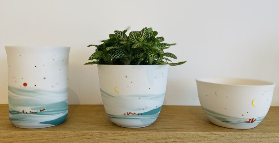 • Porcelaine teintée artisanalement – cuite à haute température – Détails engobes et or fin