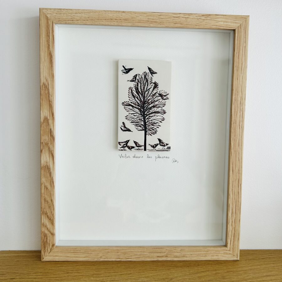 Impression végétale sur porcelaine, parfois travaillée aux oxydes ou pigments. La porcelaine est ensuite découpée et façonnée patiemment à la main, cuite plusieurs fois à haute température avant d’être collée en surépaisseur sur un support cartonné et encadrée, après avoir reçu le titre inspiré par la composition.