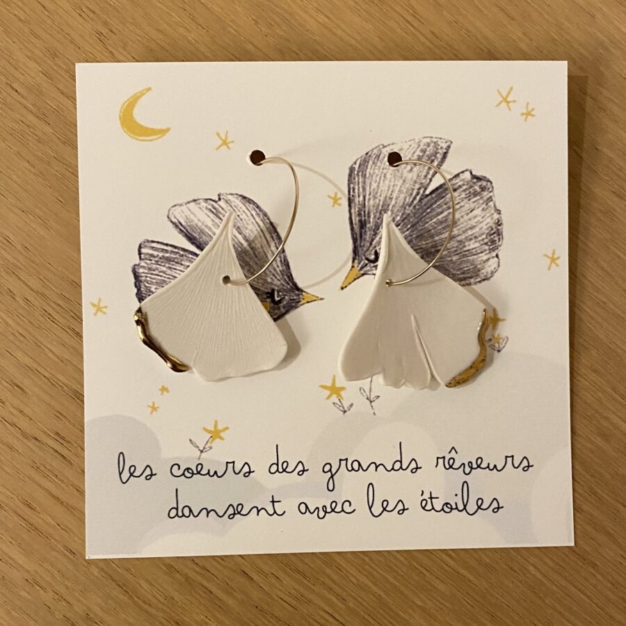 La texture de ses feuilles se prête totalement aux empreintes sur porcelaine, elle m’évoque depuis toujours un oiseau en plein vol, ce qui a donné naissance à une petite série de broches et boucles d’oreilles.