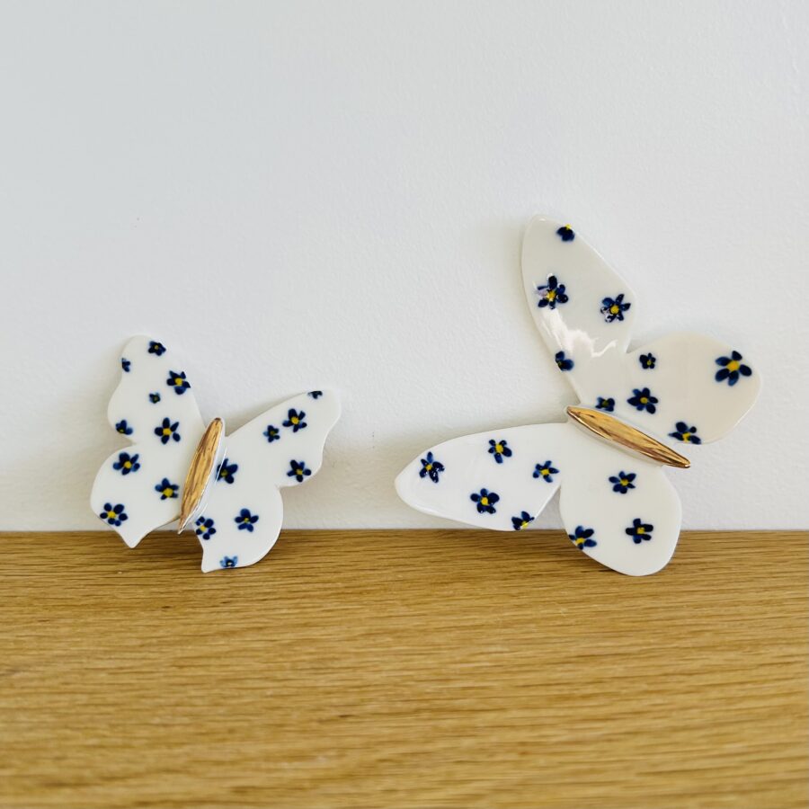 Duo de papillons en porcelaine destiné à décorer les murs de façon poétique.
